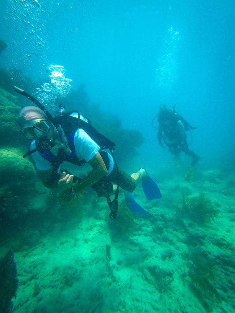On this first dive of the day, I was admittedly too excited, wanting to see every little thing I could as fast as possible. Shooting photos and videos with the GoPro of everything that moved. As always, focusing way too much on the big fish right away, being captivated by the schools of fish swimming around or hiding in the cracks of the coral reef. Got even more exciting when a few barracuda came in close to inspect what we were up to. Unfortunately, this dive I also got to experience fire coral for the first time. I wasn’t paying attention to where my fins were and accidentally kicked a piece of fire coral and made contact with my exposed ankle skin. And as its name suggests, it burns like fire on any bit of skin it touches for about 15 minutes. It was quite painful, but all the learning I needed to never go that close again.