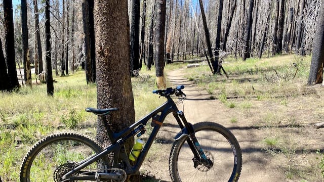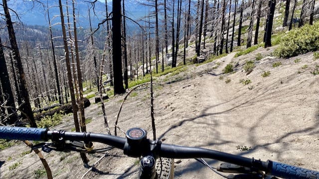 The steep topography of the area blended in with smooth trails cut across the mountainsides seemed effortless, with the soil tending to be sandy. The trails snaked their way around massive boulders and rock outcroppings that rested on the steep terrain. This led to complex, but smooth drops and rollovers, connecting with the trails below. But that’s at the granular level, because the most shocking part was the trail was entirely through the remains of the Caldor Forest Fire that ripped through the hillside in 2021. Ten times out of ten, I’d much rather be riding in a dense forest than not, but getting to ride or ski through a burn is quite the unique experience. Not only is it visually striking to be able to look through the forest, past the charged remains of the pine trees, but also how fragile the ecosystem is. It’s hard to fathom one day riding your favorite trail system, with all the leaves and trees, and the next, it’s a barren landscape with only the definition of a bike trail showing signs of life. On the lighter side of things,